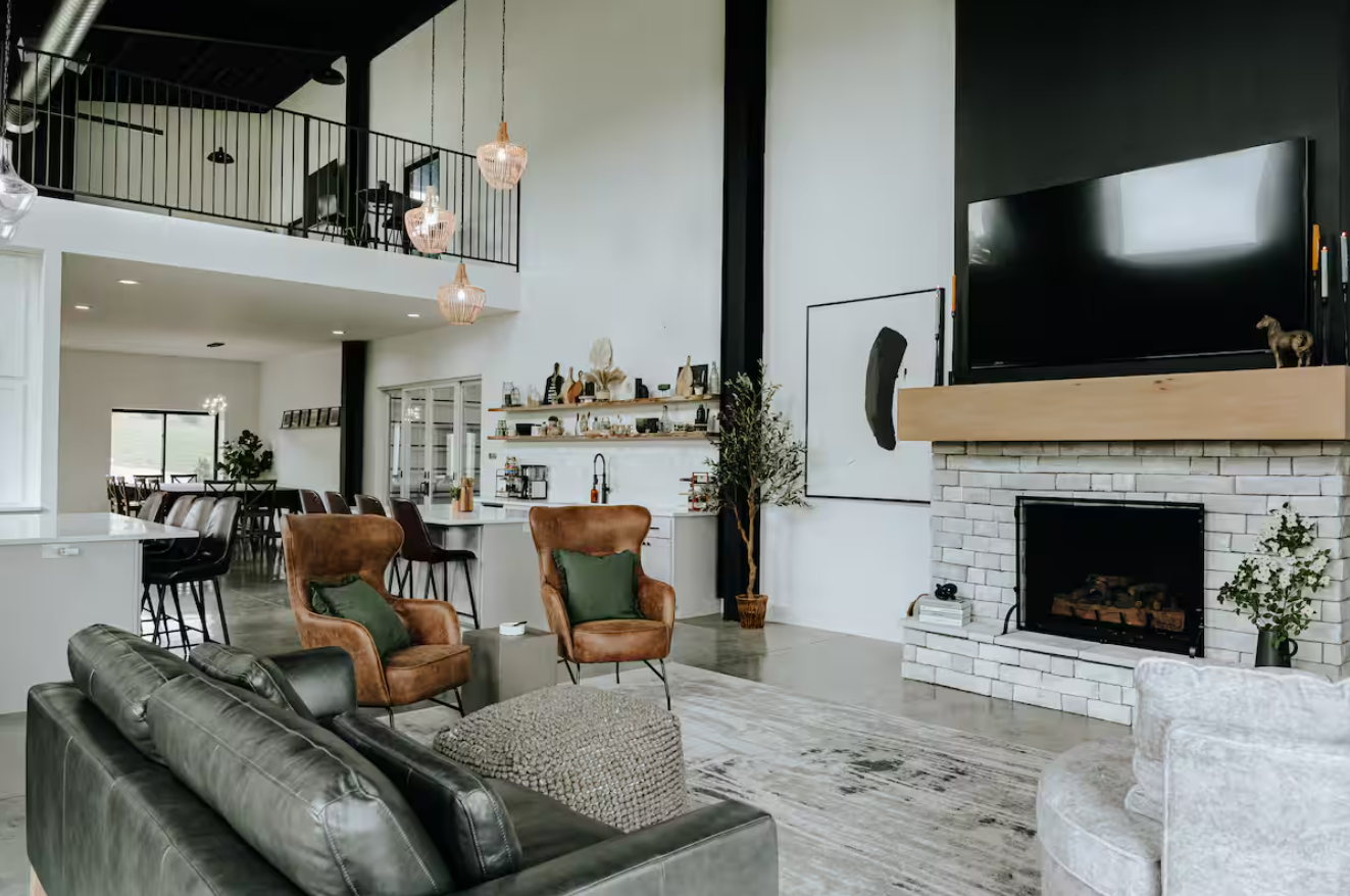 •Over 10,000ft² of farmhouse luxury w/huge pull through garage to host 22+ guests, play corn-hole + shoot hoops, or park a tour bus