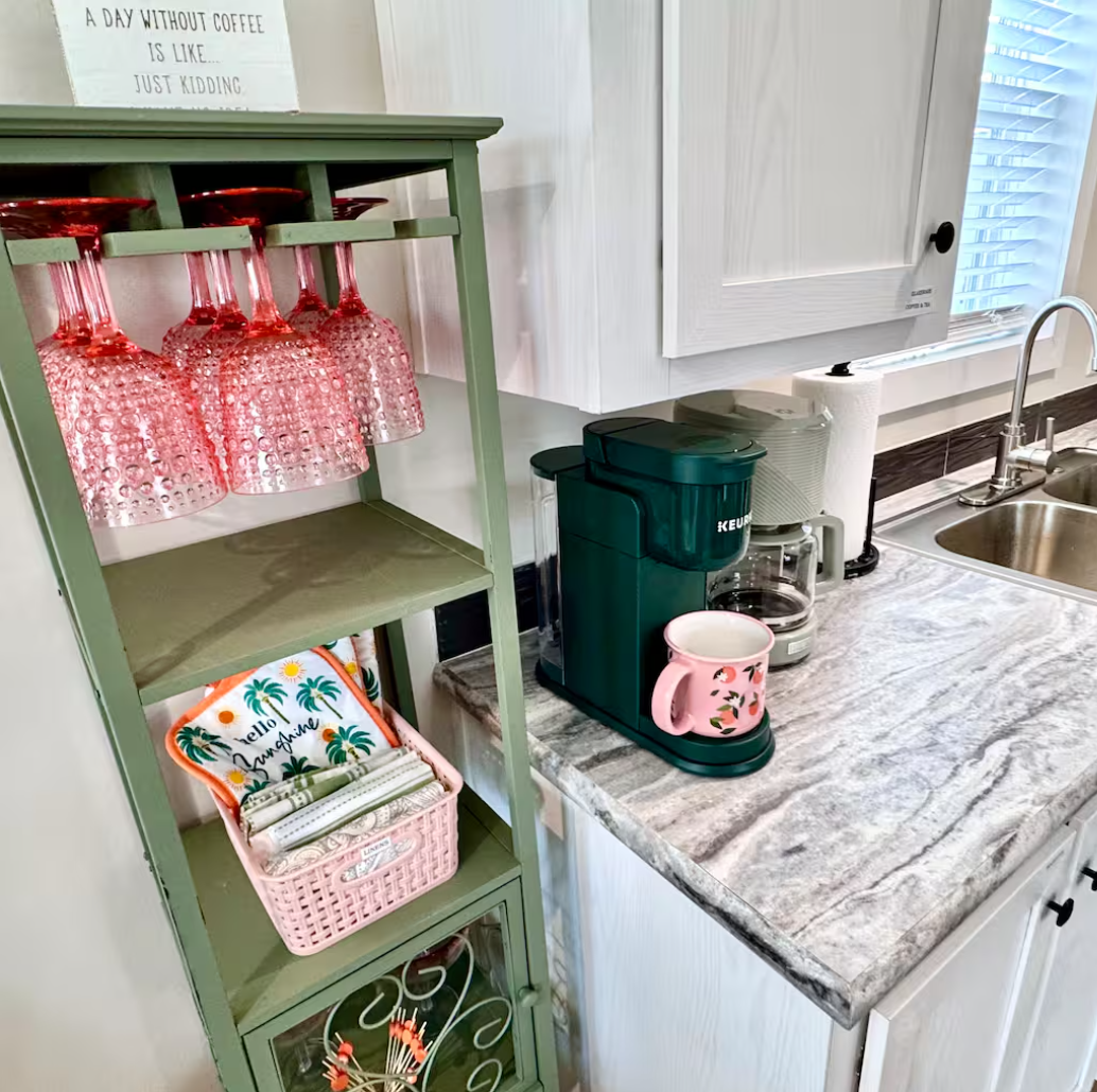 •Eat-in kitchen equipped w/full sized fridge, oven, microwave + stocked coffee bar