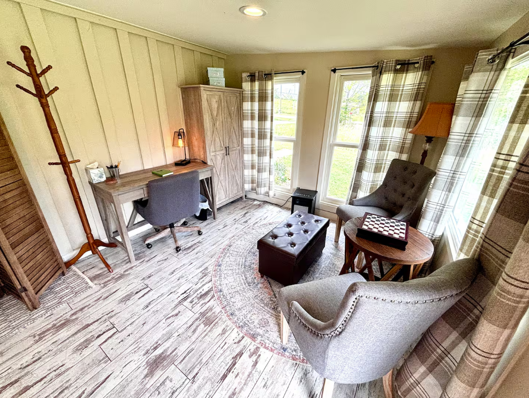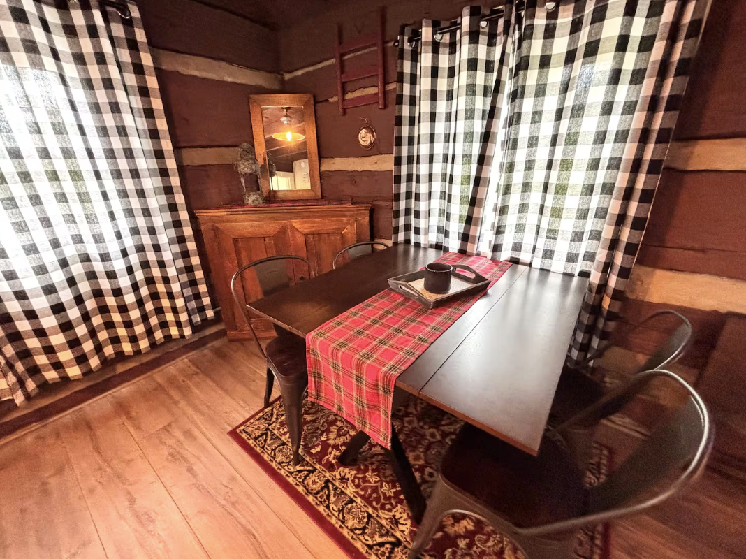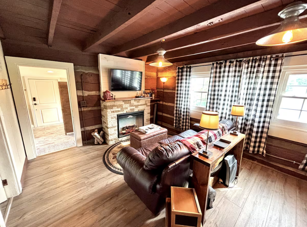 Once a US Forest Service Station, The Little Green Cabin was relocated when the land to form the lake was impounded in the 1940's. When you step inside this rustic chic log cabin, it feels like finding the perfect hiding place tucked away from the world! Enjoy sunshine & nature watching from the comforts of bed, snuggle up with a good book by the electric fireplace, pen your next novel at the writing desk, breathe in the fresh morning air with brunch on the deck, and simply reconnect. Our open-concept, studio cabin is the perfect destination for anyone seeking refuge, relaxation, and rest while still being close to town & Lake Cumberland.