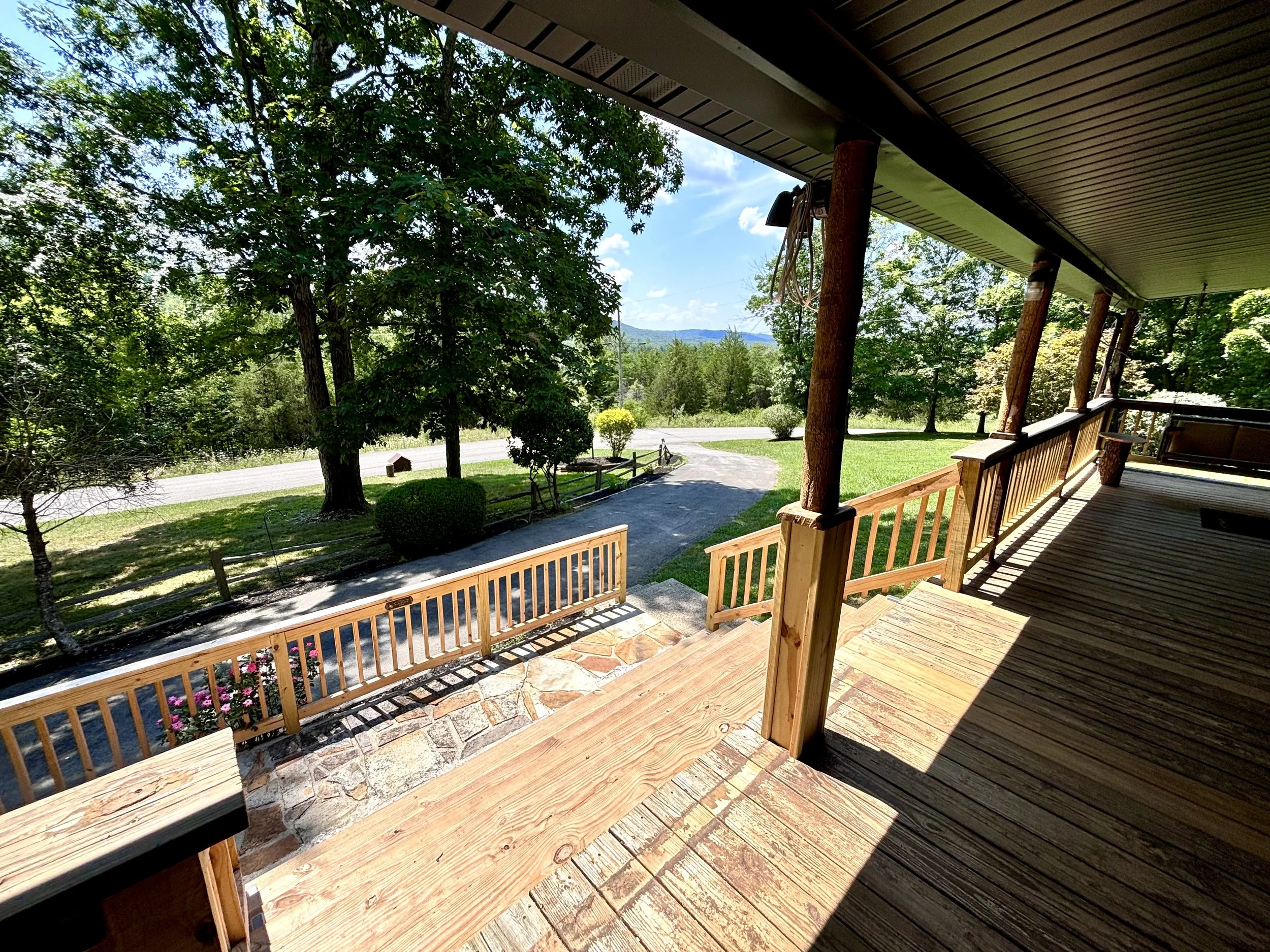 • Gorgeous views from front porch swing, upper deck fire pit area + back balcony overlooking basketball court